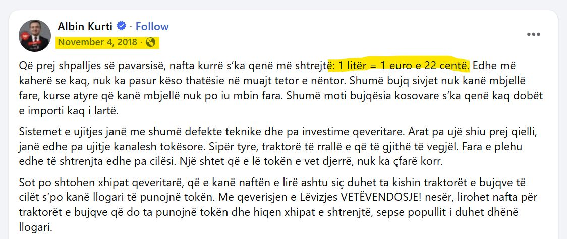 “Që prej shpalljes së pavarsisë, nafta kurrë s’ka qenë më shtrejtë: 1 litër = 1 euro e 22 centë. Edhe më kaherë se kaq, nuk ka pasur këso thatësie në muajt tetor e nëntor. Shumë bujq sivjet nuk kanë mbjellë fare, kurse atyre që kanë mbjellë nuk po iu mbin fara. Shumë moti bujqësia kosovare s’ka qenë kaq dobët e importi kaq i lartë”, thuhet në deklaratën e Kurtit në ‘Facebook’ më 2018-ën.