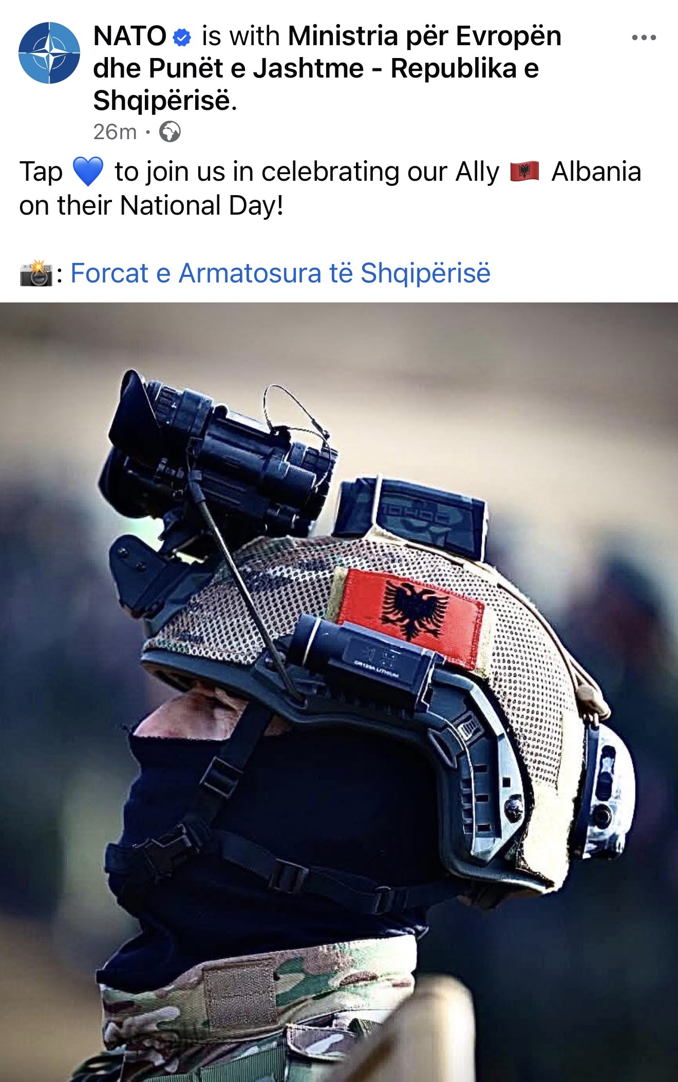 NATO ka bërë një postim në Facebook në faqen zyrtare të një ushtari të Shqipërisë në ditën e pavarësisë së kësaj të fundit.‘’Prek 💙 për t’u bashkuar me ne për të festuar Aleatin tonë 🇦🇱 Shqipërinë në Ditën e tyre Kombëtare!’’, ka shkruar NATO.