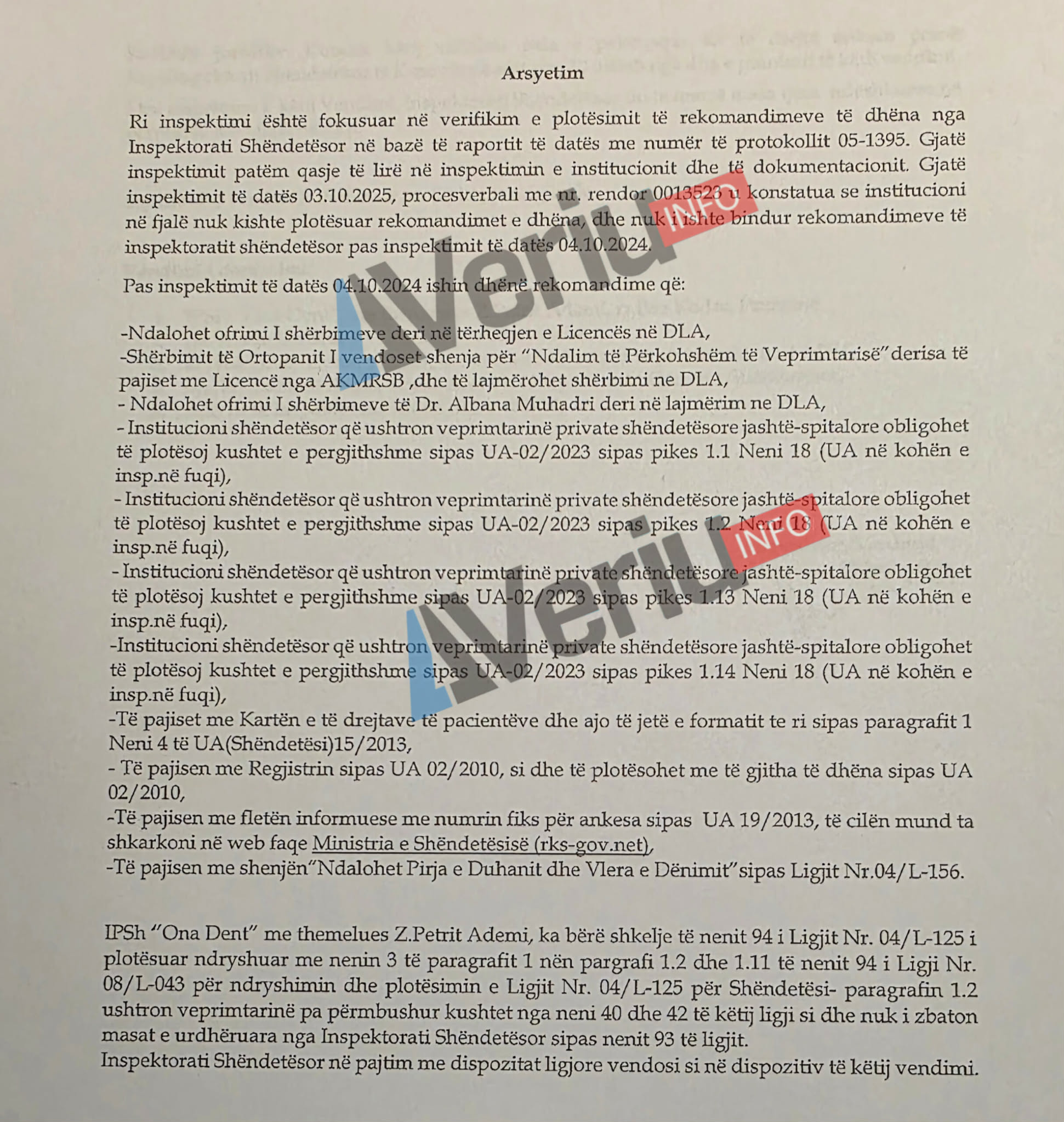 Në arsyetimin e vendimit të Inspektoratit të Shëndetësisë të datës 16.10.2025 bëhet e ditur se “Ona Dent” nuk u ishte bindur rekomandimeve të dhëna nga inspektimi fillestar, duke mos përmbushur ato, raporton Veriu.info.