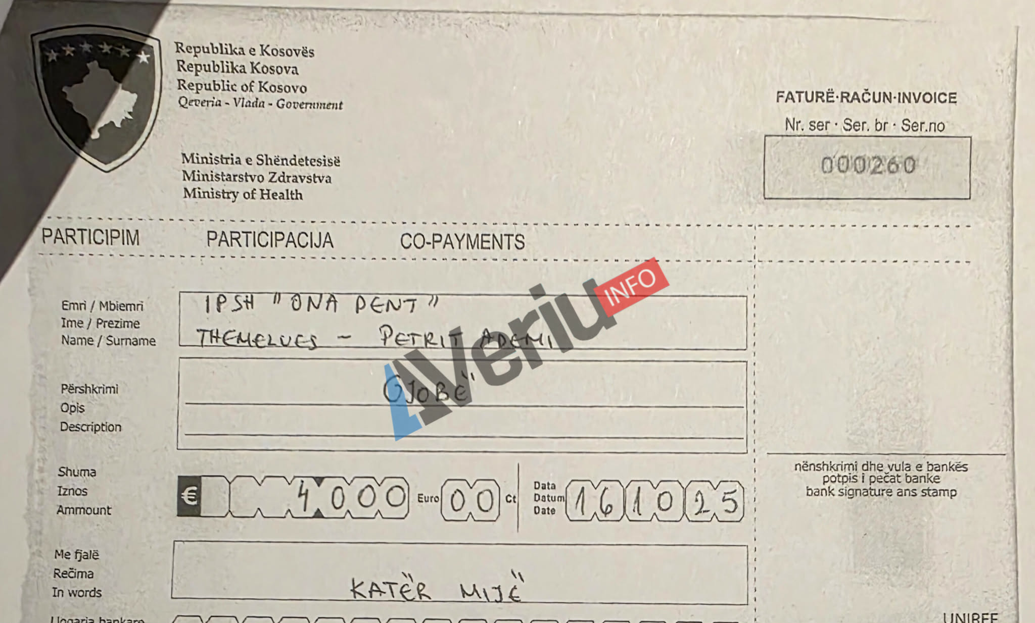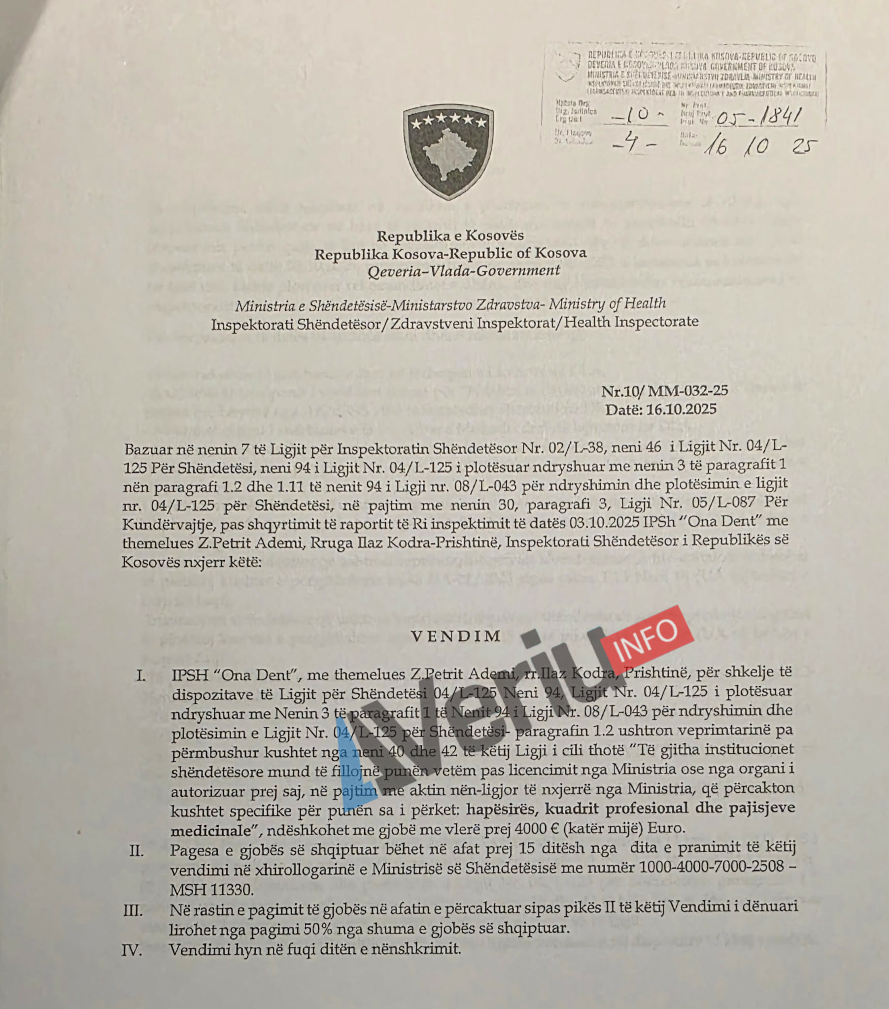 Në kuadër të një hulumtimi për parregullsitë në sektorin privat të shëndetësisë, Veriu.info ka siguruar një vendim të Inspektoratit Shëndetësor të Ministrisë së Shëndetësisë me të cilin është gjobitur me 4 mijë euro IPSh (Institucioni Privat Shëndetësor) “Ona Dent” me themelues Petrit Ademi për shkelje të dispozitave të Ligjit të Shëndetësisë.