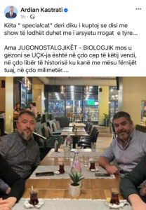 “Këta ” specialcat” deri diku i kuptoj se disi me shoë të lodhët duhet me i arsyetu rrogat e tyre… Ama JUGONOSTALGJIKËT – BIOLOGJIK mos u gëzoni se UÇK-ja është në çdo cep të këtij vendi, në çdo libër të historisë ku kanë me mësu fëmijët tuaj, në çdo milimetër….”, ka shkruar Kastrati.