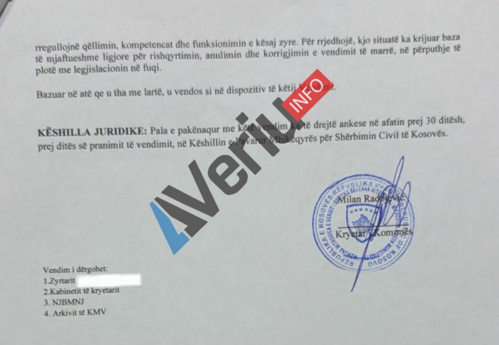 Veriu.info ka siguruar një vendim të kryetarit të Mitrovicës së veriut, Milan Radojevic, me të cilin i ndërprehet marrëdhënia e punës një shqiptari në këtë komunë, pas punës gjashtë mujore të tij.