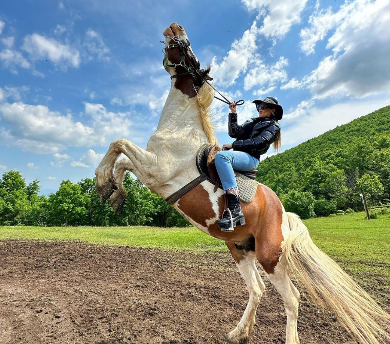 Si një kauboje e vërtetë, aktorja kosovare ka bërë prova akrobatike me kalin e saj. Njëri nga shokët më të afërm të saj ka gjetur kohë për humor me Norën.