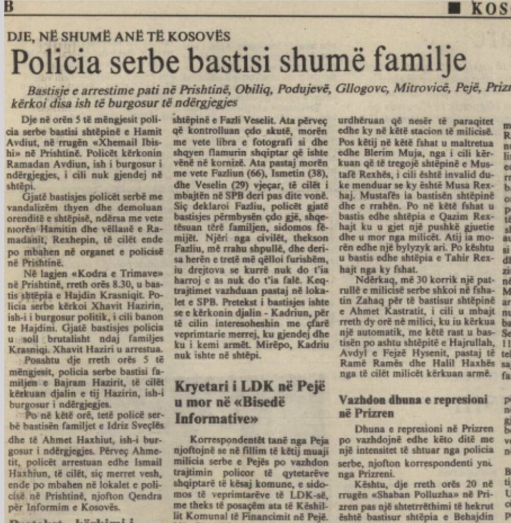 Siç raportonte atë kohë gazeta “Bujku”, policët serbë e kërkonin Kadri Veselin, por ai nuk ishte në shtëpi.