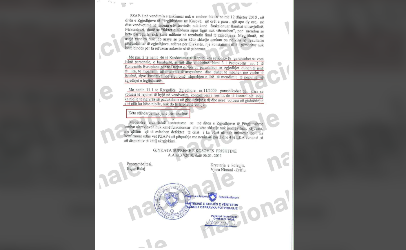 Gjykata Supreme kishte arsyetuar Aktgjykimin e saj që urdhëronte rivotim se “nuk janë përmbushur standardet” që kërkohen me Kushtetutën e Kosovës, Konventën Evropiane për të Drejtat e Njeriut dhe në Rregullën Zgjedhore të KQZ-së.