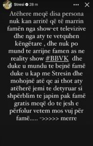 “Atëherë meqë disa persona nuk kanë arritë që të marrin famën nga show-et televizive dhe nga aty të vetëquhen këngëtare, dhe nuk po mund të arrijnë famën as në reality show BBVK dhe duke u munduar të bëjnë famë duke u kapur me Stresit, atëherë detyrohemi t’i shpërblejmë me pak famë gratis”, thuhet në reagimin e ndarë në Instagramin e Stresit.