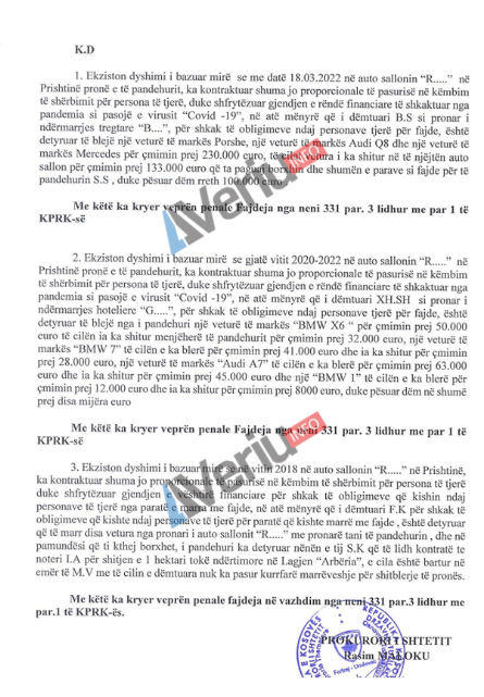 Sipas aktakuzës, Kreshnik Dervishi dyshohet se më 18 mars 2022, në autosallonin “Royal”, ka kontraktuar shuma jo proporcionale të pasurisë, duke shfrytëzuar gjendjen e rëndë financiare të të dëmtuarit Samir Bajrami, që e kishte për shkak të obligimeve ndaj personave të tjerë për fajde.