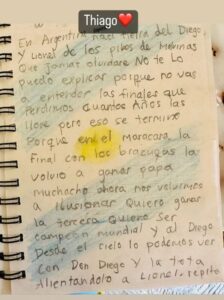 Vetëm një ditë para finales së madhe të Kupës së Botës e cila do të luhet nesër, ditën e dielën në orën 16:00, djali i madh i Lionel Messit ka shkruar një letër emocionuese për babain e tij dhe të gjithë skuadrën e Argjentinës.