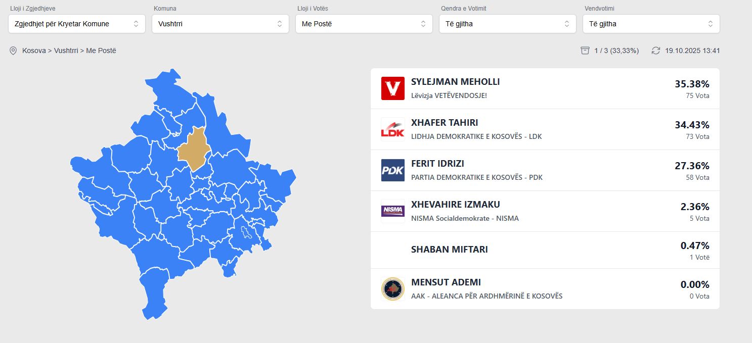 Sipas të dhënave të KQZ-së, nga ky numërim del që Sylejman Meholli i VV-së ka marrë plot 75 vota, Xhafer Tahiri i LDK-së ka rrëmbyer 73 vota, derisa Ferit Idrizi i PDK-së ka grumbulluar gjithsej 58 vota.
