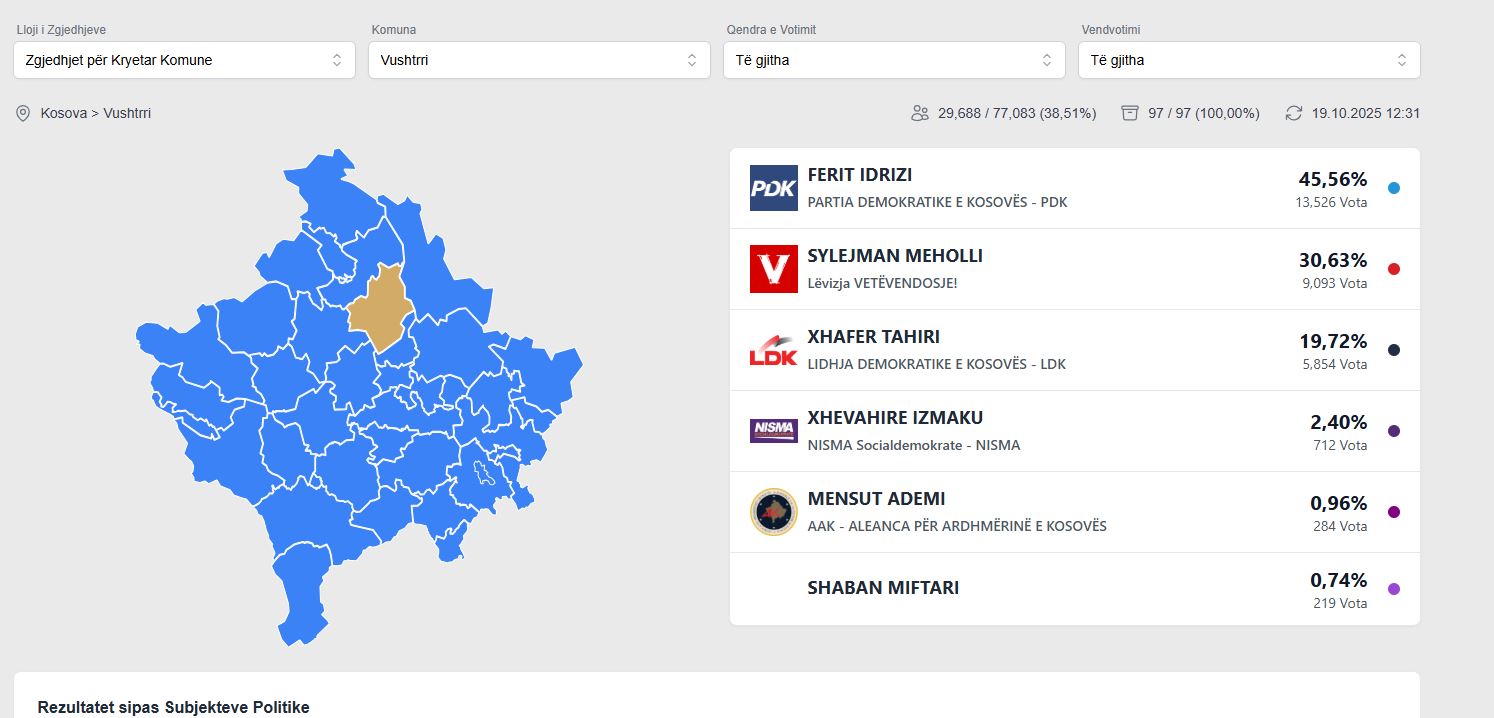 Ndërkaq sipas rezultateve preliminare, në këtë komunë udhëheq Idrizi me 45.56% të votave, e pas tij Sylejman Meholli me 30.63%.