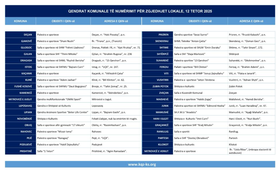 Kjo është lista dhe adresat e 38 Qendrave Komunale të Numërimit për Zgjedhjet Lokale 2025, ku do të numërohen votat e kandidatëve për Kuvende Komunale
