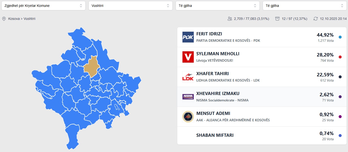 KQZ ka filluar publikimin e rezultateve të para zyrtare në faqen e saj. Nga 12.37% e votave të numëruara në Vushtrri po prin Ferit Idrizi i PDK-së me 44.92% të votave, raporton Gazeta Online Veriu.info. <img class="aligncenter size-full wp-image-313392" src="https://veriu.info/wp-content/uploads/2025/10/557537786_1388396383294418_766851289277982288_n-600x360-4.jpg" alt="" width="1419" height="619" />