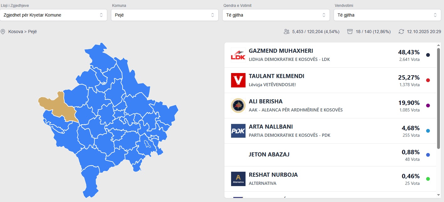 Nga numërimi i parë i votave në Pejë, saktësisht 12.86%, atje po prin Gazmend Muhaxheri i LDK-së me 48.43% të votave, raporton Gazeta Online Veriu.info.