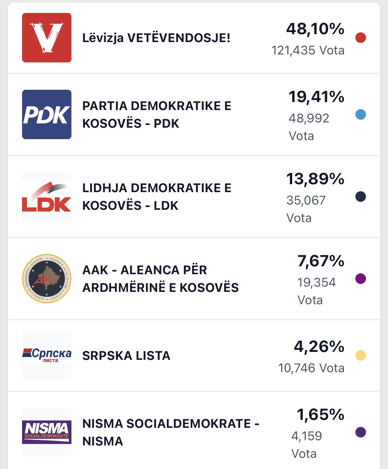 Janë numëruar 33.52% të kutive të votimit në zgjedhjet e parakohshme, Lëvizja Vetëvendosje kryeson me një diferencë të qartë, duke arritur 48.10% të votave. PDK renditet e dyta me 19.41%, ndërsa LDK merr 13.89% dhe AAK 7.67%.