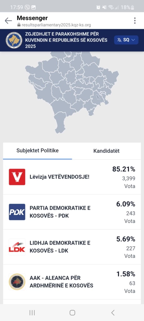 PDK 243 vota apo 6,09%, LDK 227 vota apo 5,69%. AAK 63 vota apo 1,58%.