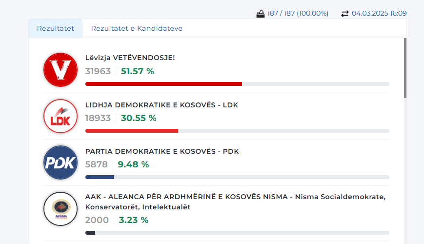 Në përditësimin e fundit tëbërë të KQZ-së, është bërë e ditur se Lëvizja Vetëvendosje ka marrë me 51.57%, ose 31963 vota.