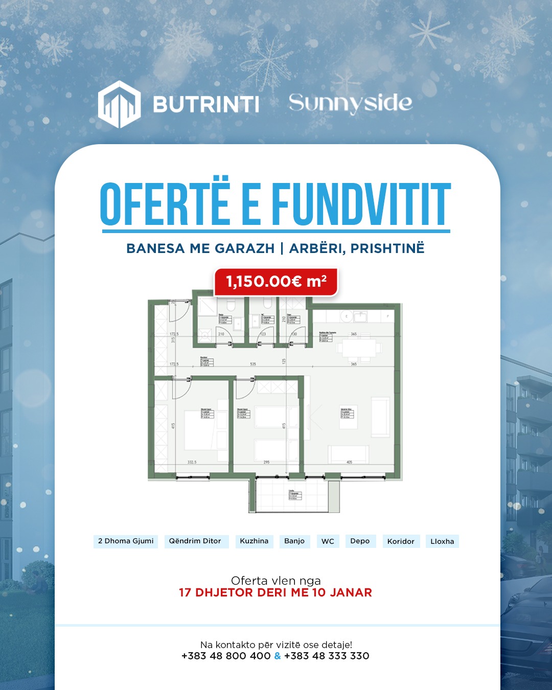 Kompania e shquar “Butrinti Group” ju fton të përfitoni nga oferta ekskluzive e fundvitit për banesa në lagjen Arbëria (ish Dragodan) të Prishtinës, të cilat vlejnë vetëm deri në fund të vitit.