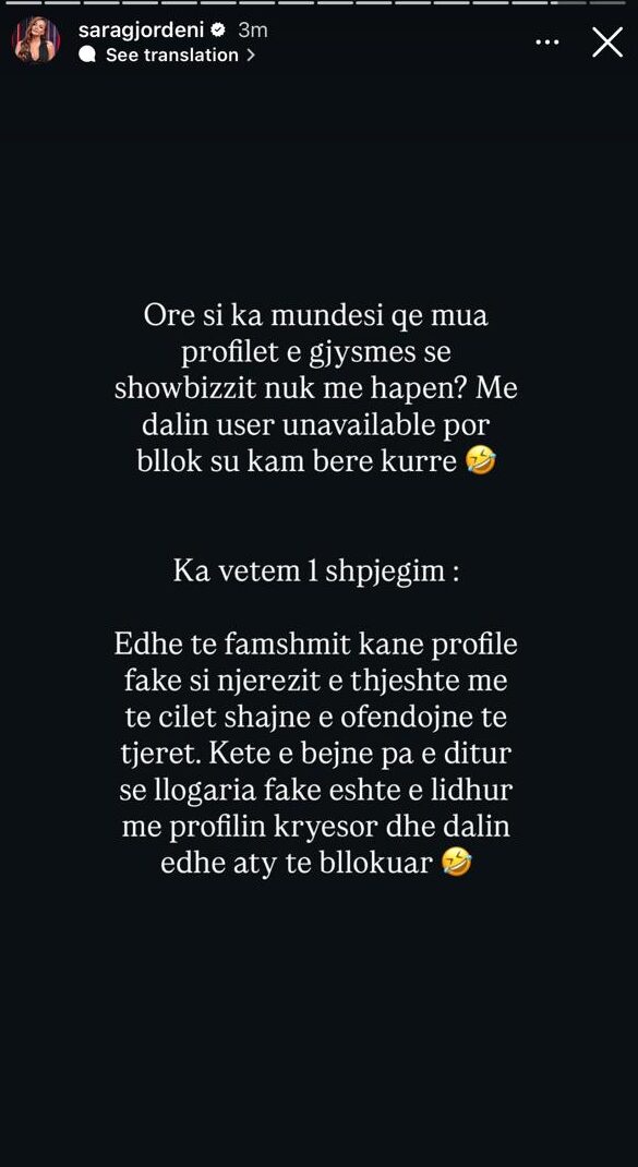 “Ka vetëm një shpjegim”, shkruan Sara. “Edhe të famshmit kanë profile fake si njerëzit e thjeshtë, me të cilët shajnë e ofendojnë të tjerët. Këtë e bëjnë pa e ditur se llogaria fake është e lidhur me profilin kryesor dhe dalin edhe aty të bllokuar.”