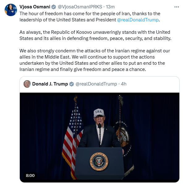 Vjosa Osmani ka reaguar me një deklaratë të fortë lidhur me zhvillimet e fundit në Lindjen e Mesme, duke theksuar mbështetjen e plotë të Republika e Kosovës për Shtetet e Bashkuara dhe aleatët e saj.