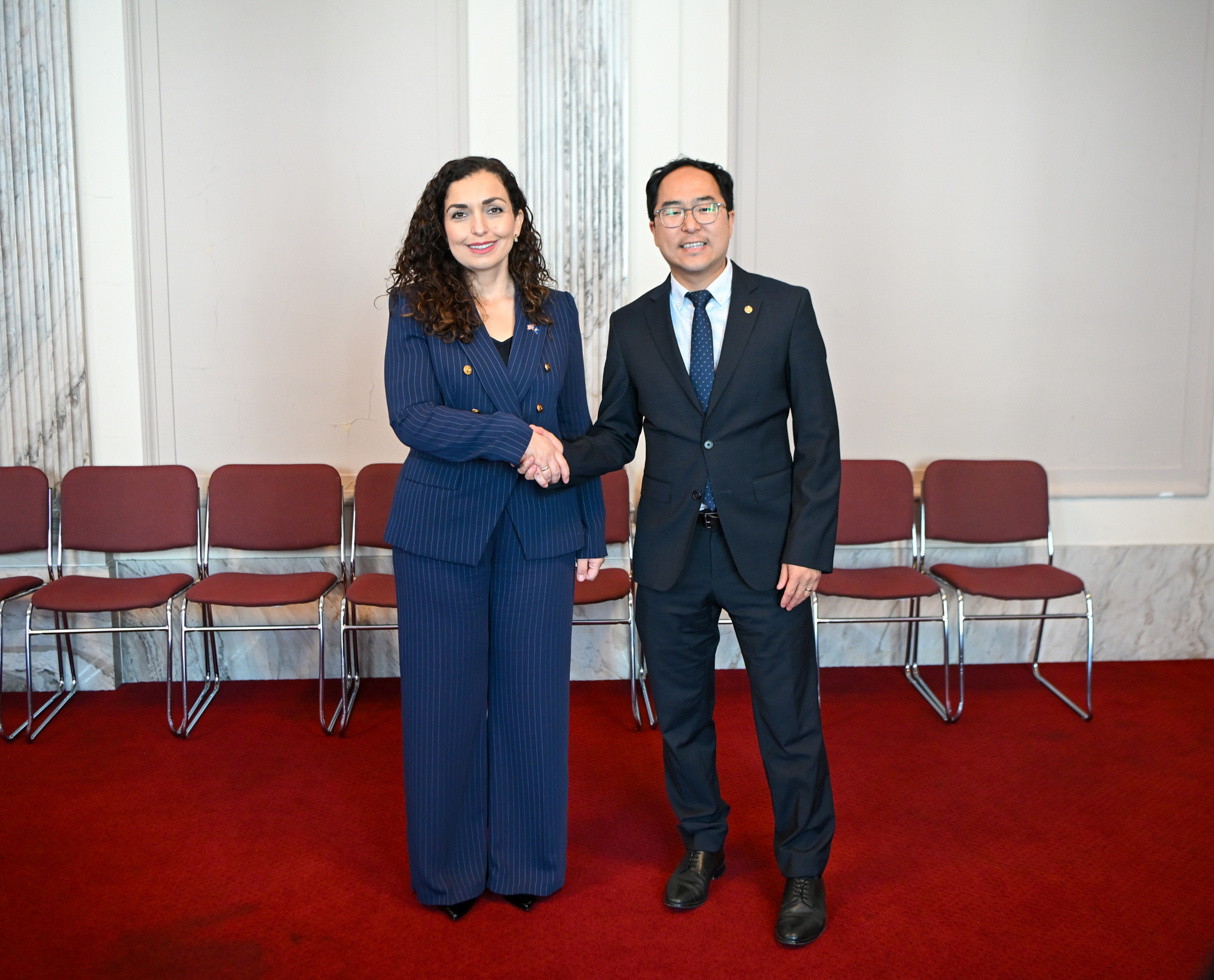 ”Kosova është e bekuar me mbështetjen e fuqishme dhe të palëkundur të Kongresit Amerikan.Në Washington D.C., kisha kënaqësinë ta takoj Senatorin Andy Kim, për të diskutuar forcimin e partneritetit strategjik midis Kosovës dhe Amerikës në fusha të ndryshme të interesit të përbashkët, përfshirë sigurinë, zhvillimin ekonomik dhe inovacionin”, ka shkruar Osmani.