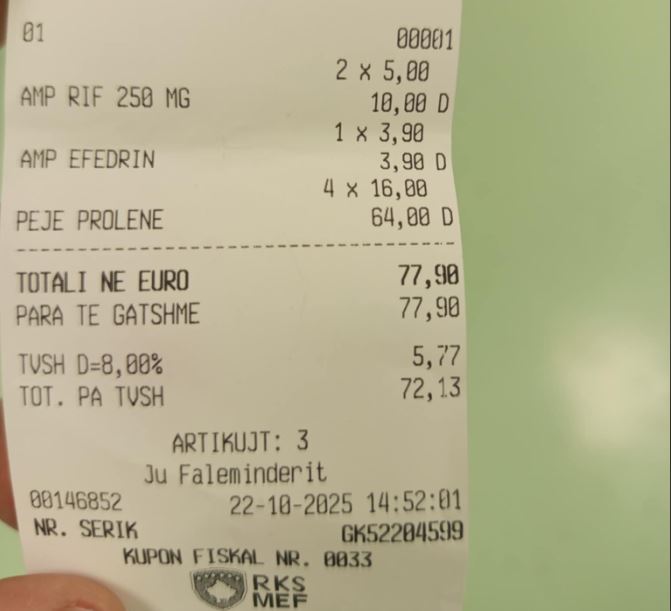 Krahas kësaj, po i njëjti pacient, pos penjeve u detyrua ta blejë edhe një ampulë bazike që aplikohet gjatë dhënies së anestezionit dhe që është pjesë e listës esenciale. Bëhet fjalë për amp. Efedrin, ku pacientit kjo i ka kushtuar diku 4 euro në barnatore private, njofton Klan Kosova.