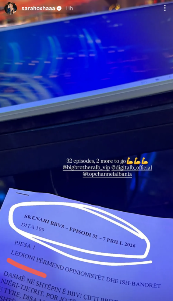 Ajo ka publikuar një foto të skenarit të spektaklit, ku duket qartë data e mbrëmshme, 7 prill 2026, dhe shënimi për episodin e 32-të të këtij sezoni, si dhe hyrja ku Ledioni përmend opinionistët dhe ish-banorët.
