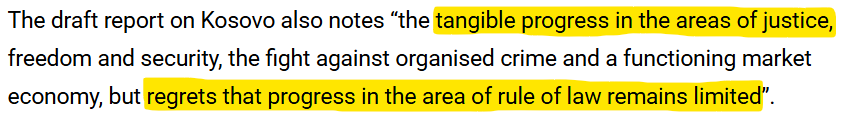 “Progresi i prekshëm në fushat e drejtësisë, lirisë dhe sigurisë, luftës kundër krimit të organizuar dhe një ekonomie tregu funksionale, por shpreh keqardhje që progresi në fushën e sundimit të ligjit mbetet i kufizuar”.