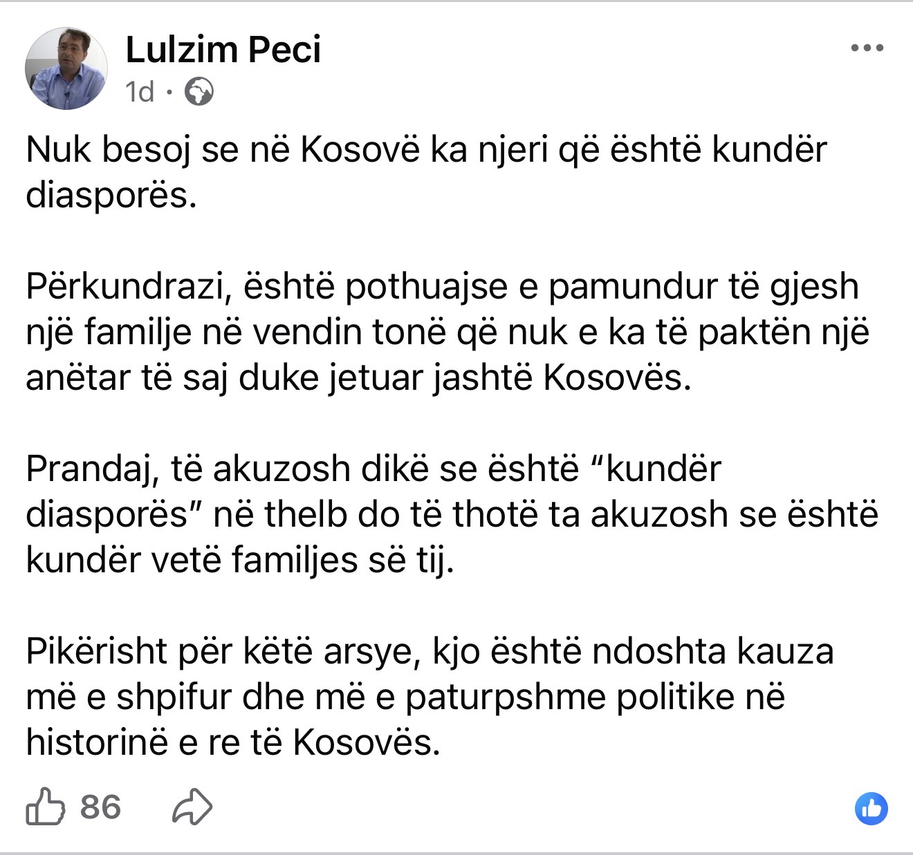 “Nuk besoj se në Kosovë ka njeri që është kundër diasporës. Përkundrazi, është pothuajse e pamundur të gjesh një familje në vendin tonë që nuk e ka të paktën një anëtar të saj duke jetuar jashtë Kosovës. Prandaj, të akuzosh dikë se është “kundër diasporës” në thelb do të thotë ta akuzosh se është kundër vetë familjes së tij. Pikërisht për këtë arsye, kjo është ndoshta kauza më e shpifur dhe më e paturpshme politike në historinë e re të Kosovës”, ka shkruar Peci.