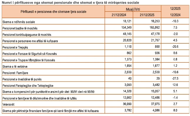 “Në muajin dhjetor 2025, krahasuar me muajin dhjetor 2024, kishte rënie të numrit të përfituesve nga: skema për pensionet invalidore (-27,5 %); skema për pensionet e Trepçës (-20,6 %); skema për pensionet familjare (-10,6 %); skema e ndihmës sociale (-10,3 %); skema e pensioneve kontribut- paguesve të moshës (-2,0 %); skema për familjet e dëshmorëve dhe invalidët e luftës (-1,4 %)”, thuhet në njoftimin e ASK-së.