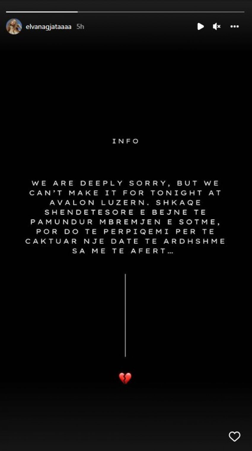 Elvana tha se i vjen shumë keq për anulimin, por do të punojnë ta bëjnë një datë tjetër në një moment të afërt.