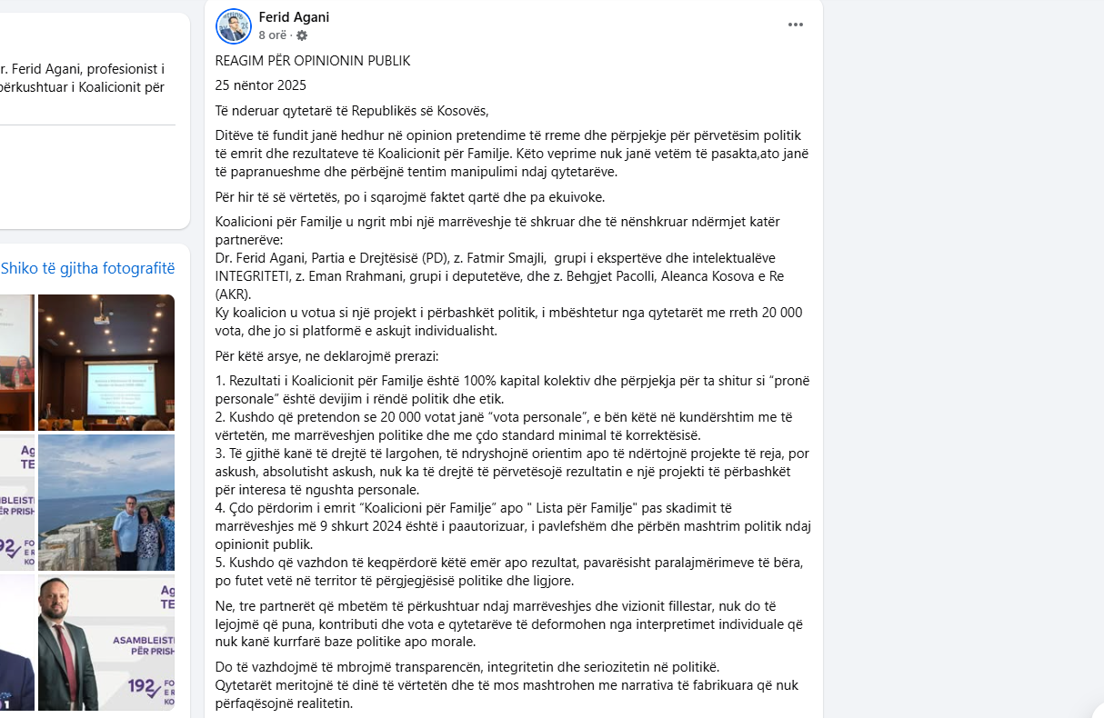 “Për këtë arsye, ne deklarojmë prerazi: 1. Rezultati i Koalicionit për Familje është 100% kapital kolektiv dhe përpjekja për ta shitur si “pronë personale” është devijim i rëndë politik dhe etik. 2. Kushdo që pretendon se 20 000 votat janë “vota personale”, e bën këtë në kundërshtim me të vërtetën, me marrëveshjen politike dhe me çdo standard minimal të korrektësisë. 3. Të gjithë kanë të drejtë të largohen, të ndryshojnë orientim apo të ndërtojnë projekte të reja, por askush, absolutisht askush, nuk ka të drejtë të përvetësojë rezultatin e një projekti të përbashkët për interesa të ngushta personale. 4. Çdo përdorim i emrit “Koalicioni për Familje” apo ” Lista për Familje” pas skadimit të marrëveshjes më 9 shkurt 2024 është i paautorizuar, i pavlefshëm dhe përbën mashtrim politik ndaj opinionit publik”, ka shkruar ai.