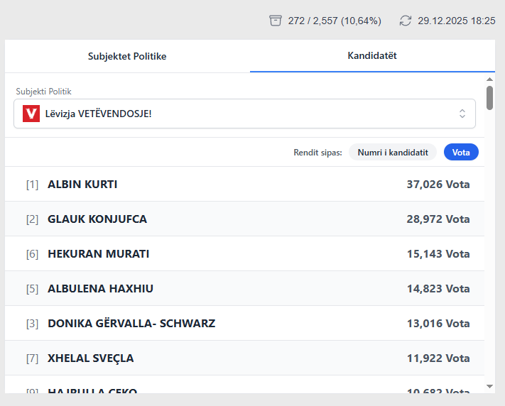 Nga rezultatet e deritashme, tek lista e VV’së më i votuari është Albin Kurti me 37 mijë e 26 vota. Pas tij renditen Glauk Konjufca me 28 mijë e 972, Hekuran Murati me 15 mijë e 143 vota, Albulena Haxhiu me 14 mijë e 823 vota dhe Donika Gërvalla me 13 mijë e 16 vota, shkruan Reporteri.net.