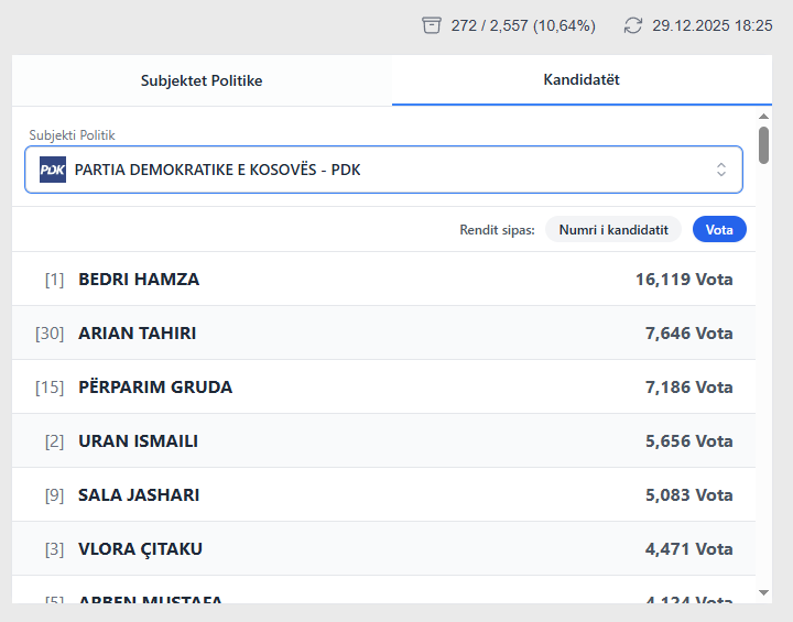 Nga PDK, më të votuarit janë Bedri Hamza me 16 mijë e 119 vota, Arian Tahiri me 7 mijë e 646 vota, Përparim Gruda me 7 mijë e 186 vota, Uran Ismaili me 5 mijë e 656 vota dhe Sala Jashari me 5 mijë e 83 vota.