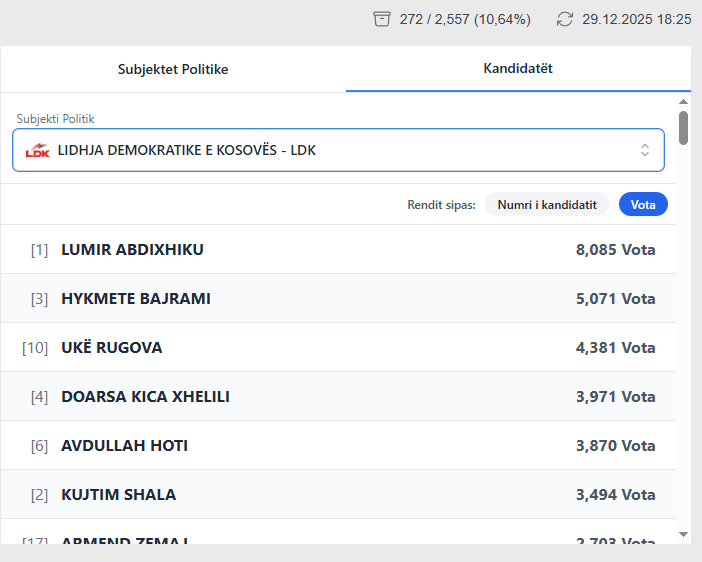 Pas tij renditen Hykmete Bajrami me 5 mijë e 71 vota, Ukë Rugova me 4 mijë e 381, Doarsa Kica Xhelili me 3 mijë e 971 vota dhe Avdullah Hoti me 3 mijë e 870.