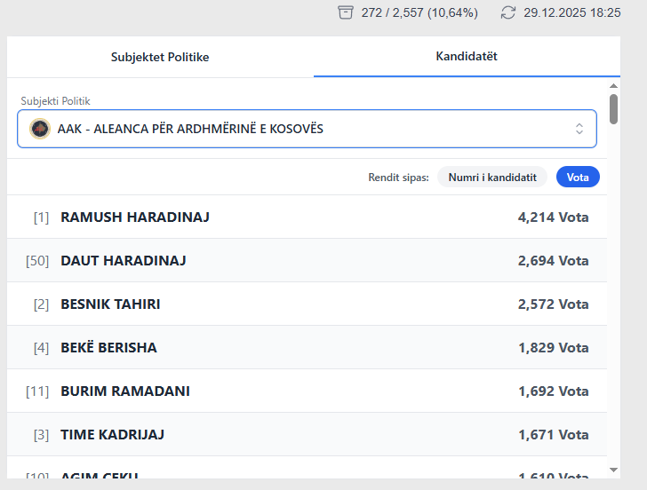 Lista vazhdon me Daut Haradinajn me 2 mijë e 694 vota, Besnik Tahiri 2 mijë e 572, Bekë Berisha 1 mijë e 829 vota dhe Burim Ramadani 1 mijë e 692 vota.