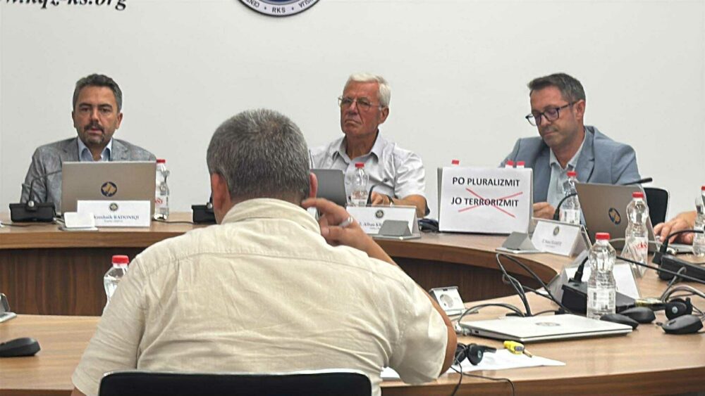 Burri i Albulena Haxhiut, përfaqësuesi i LVV-së në KQZ, Alban Krasniqi në nisje të mbledhjes ka vendosur një pankartë me fjalët “Po pluralizmit, jo terrorizmit”.