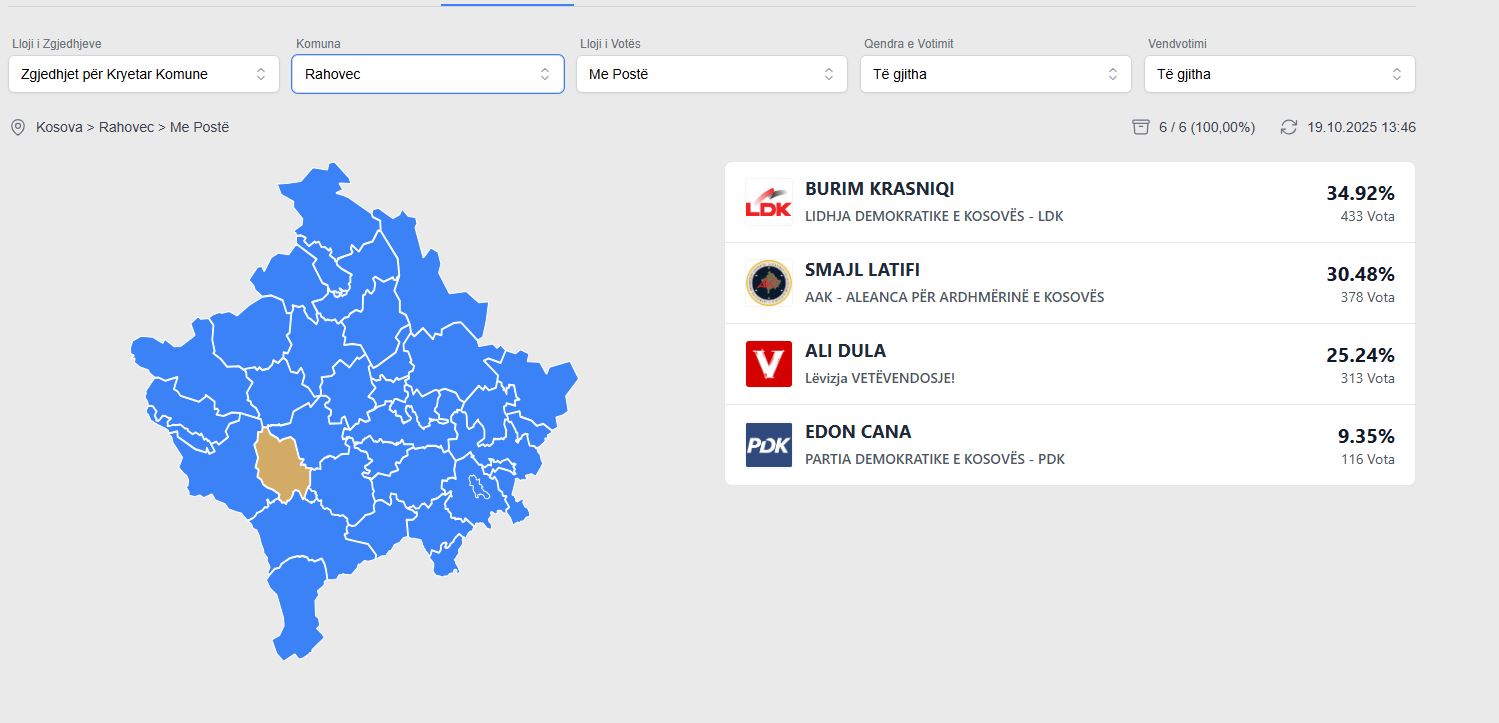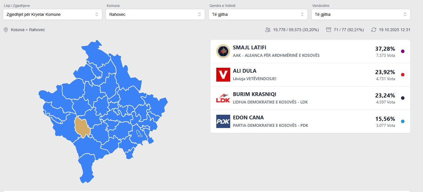 Ndërkaq në rezultatet preliminare të zgjedhjeve të 12 tetorit, udhëheq Latifi me 37.28%, derisa pas tij radhitet Ali Dula i VV-së me 23.92%.
