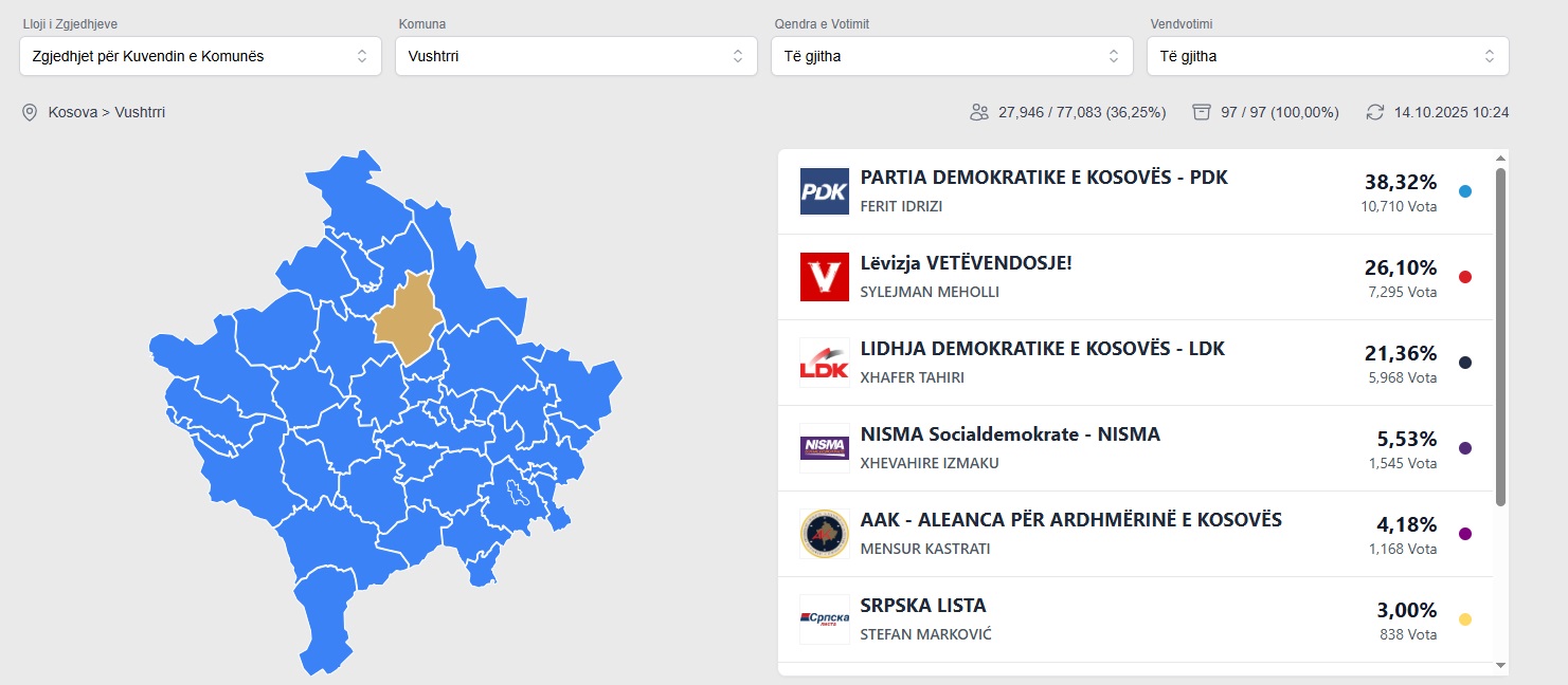 Sipas të dhënave nga KQZ, prin PDK me kryetar Ferit Idrizin me 38,31% (10,710 vota), më pas vjen LVV me Sylejman Mehollin me 26,10% (7,295 vota), ne vendin e tretë vjen LDK me 21,36% (5,968 vota), NISMA ME 5,53%(1,545 vota), AAK me 4,18%(1,168 vota).