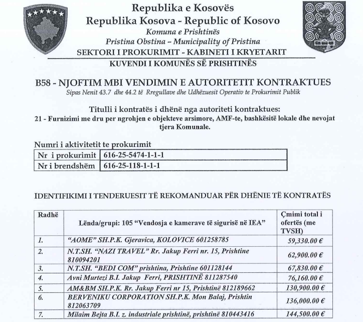 Në tender kanë marrë pjesë shtatë kompani, por njëra prej tyre, që kishte ofruar pothuajse trefish më lirë (59,333 euro), u përjashtua me arsyetimin se çmimi ishte “jo normalisht i ulët”, sipas nenit 61 dhe nenit 41.3 të Ligjit për Prokurim Publik.