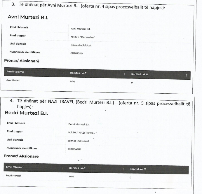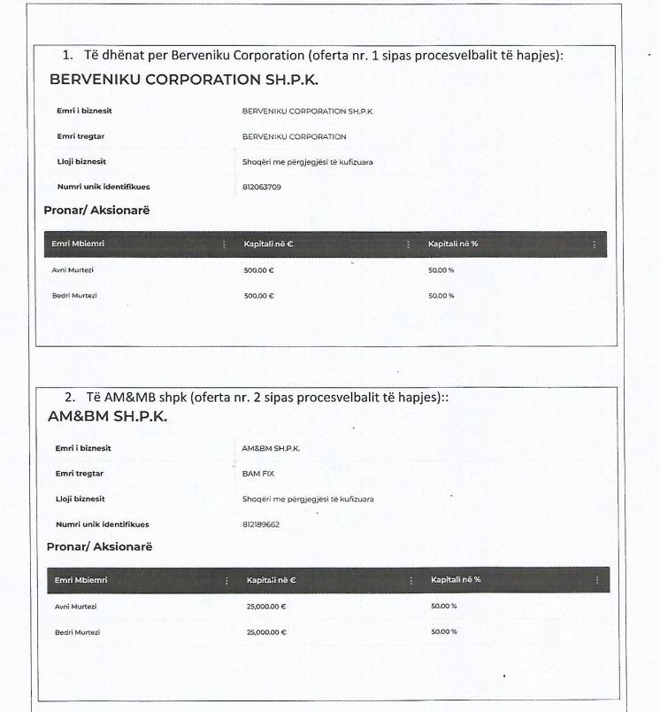 ofertat e katër kompanive që kanë pronarë të njëjtë. Kjo i bie që një pronar ka dorëzuar katër oferta për të njëjtin tender. Sipas të dhënave në regjistrat e ARBK-se shihet qartë se Avni Murtezi dhe Bedri Murtezi janë bashkëpronar ose pronar të vetëm në këto katër firma: