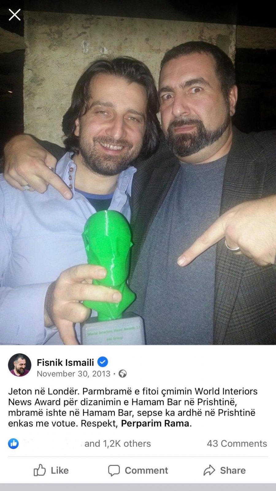 “Jeton në Londër. Parmbramë e fitoi çmimin World Interiors News Award për dizainimin e Hamam Bar në Prishtinë, mbramë ishte në Hamam Bar, sepse ka ardhë në Prishtinë enkas me votue. Respekt, Përparim Rama”, shkruante Ismaili në Facebook.