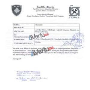 Veriu.info ka siguruar dokumentin ku u.d. i kryeshefit përmes një njoftimi drejtuar udhëheqësit të njësisë biznesore Minierat me Flotacion Stantërg, ku e njofton këtë të fundit se do të fillojnë procedurat disiplinore ndaj punëtorëve të kësaj ndërmarrje që janë të suspenduar përkohësosht.