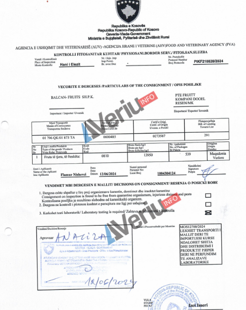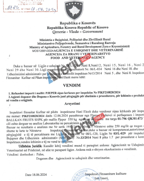 Duke u bazuar në këto analiza laboratorike, AUV më datë 18.06.2024 ka nxjerrë vendim për refuzim të importit të 550 kilogram pjepër për kompaninë “Ballkan Fruits” Sh.P.K.