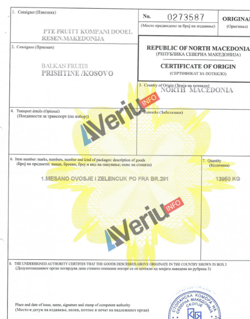Sipas dokumenteve që i posedon Veriu.info, kjo sasi e pjeprit nga “Ballkan Fruits” Sh.P.K. ishte blerë në Maqedoni të veriut.