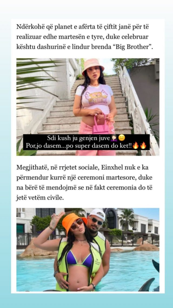Kujtojmë që Einxhel dhe Dagz, dashuria e të cilëve lindi brenda shtëpisë së “Big Brother VIP”, janë në pritje të fëmijës së tyre të parë. Ata pritet të bëhen shumë shpejt me një djalë.