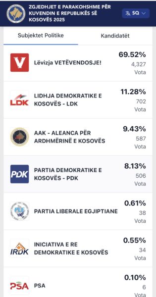 Janë numëruar 25 për qind e votave me postë. Sipas përditësimit të fundit, VV prin me 69.52 për qind, më pas vjen LDK me 11.28 për qind. AAK me 9.43 për qind, PDK me 8.13 për qind. <figure class="wp-block-image size-large"><img class="wp-image-2981783" src="https://www.gazetaexpress.com/wp-content/uploads/2026/01/IMG_2521-315x600.jpeg" sizes="(max-width: 315px) 100vw, 315px" srcset="https://www.gazetaexpress.com/wp-content/uploads/2026/01/IMG_2521-315x600.jpeg 315w, https://www.gazetaexpress.com/wp-content/uploads/2026/01/IMG_2521-157x300.jpeg 157w, https://www.gazetaexpress.com/wp-content/uploads/2026/01/IMG_2521-768x1464.jpeg 768w, https://www.gazetaexpress.com/wp-content/uploads/2026/01/IMG_2521-806x1536.jpeg 806w, https://www.gazetaexpress.com/wp-content/uploads/2026/01/IMG_2521-1075x2048.jpeg 1075w, https://www.gazetaexpress.com/wp-content/uploads/2026/01/IMG_2521-97x184.jpeg 97w, https://www.gazetaexpress.com/wp-content/uploads/2026/01/IMG_2521.jpeg 1170w" alt="" width="315" height="600" /></figure>