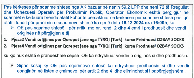 “Pas kërkesës për sqarime shtese nga AK bazuar në nenin 59.2 LPP dhe neni 72 të Rregullat dhe Udhëzuesi Operativ për Prokurimin Publik, Operatori Ekonomik është përgjigjur në sqarimet e kërkuara brenda afatit kohor të përcaktuar ne kërkesën për sqarime shtesë pasi që afati i fundit për pranimin e sqarimeve shtesë ka qenë data 16.12.2024 ora 16:00h, ku OE pas sqarime shtesë për artik. me nr. rend. 2 dhe 4 emri i prodhuesit dhe vendi i origjinës në përgjigjen e tij