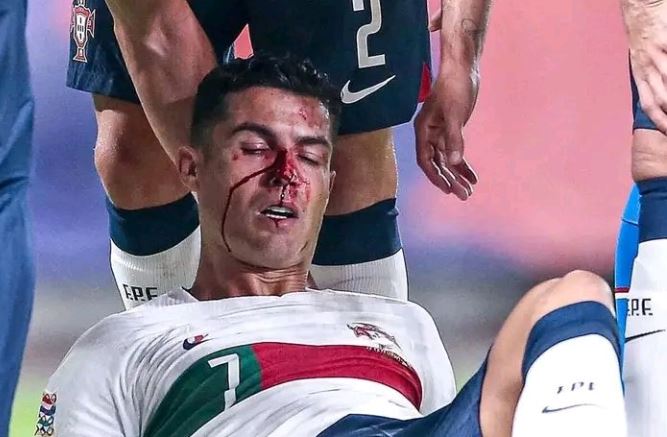 Cristiano Ronaldo mbeti i trullosur dhe me hundë të gjakosur pas një përplasjeje gjatë ndeshjes të Portugalisë me Republikën Çeke të shtunën.