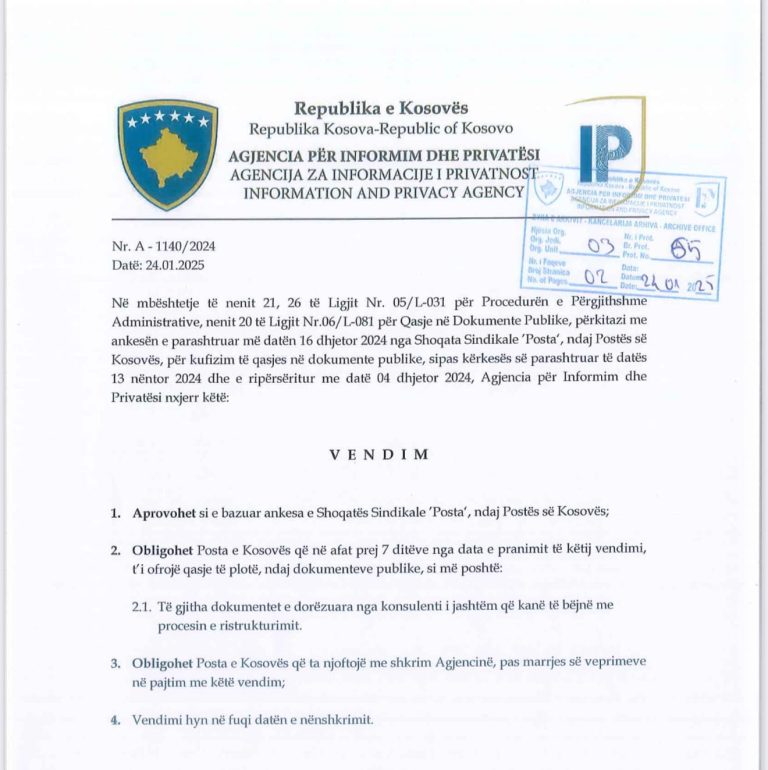 “Ju njoftojmë se dokumentet/draft struktura dhe të gjitha dokumente që lidhen me ristrukturim të PK Sh.A., të konsulentit të jashtëm të z. M. Mustafa janë ende drafte, dhe si të tilla edhe me ligjin për qasje në dokumente publike nenin 1.2(Dokument Publik– nënkupton çdo akt, fakt apo informatë në formë elektronike apo me zë, formë të shtypur, në incizime vizuale apo audiovizuale të prodhuara apo mbajtura nga institucioni publik)., andaj si të tilla nuk janë dokumente ende të aprovuara përkatësisht të prodhuara nga PK Sh.A., siç kërkon neni 1.2 i ligjit për qasje në dokumente publike“, thuhej në përgjigjen e Postës në nëntor të këtij viti.