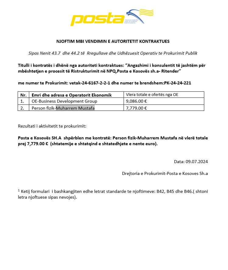 Posta e Kosovës më 19 korrik nënshkroi kontratë për “Angazhimin e një konsulenti të jashtëm për mbështetjen e procesit të ristrukturimit në NPQ, Posta e Kosovës sh.a”.